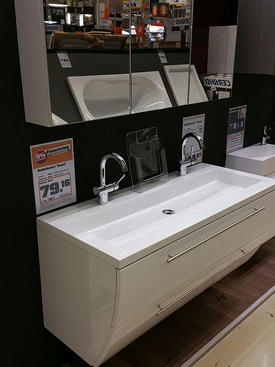 Dort gibt es zum Beispiel Waschtische, also Waschbecken mit Stauraum darunter. Dieser Stauraum besteht aus ein paar mit Folie überzogenen Sperrholzplatten. Als ich den Preis sehe, denke ich noch, ok, das ist ja günstig. Sekunden später realisiere ich, dass dieser einfache Waschtisch ohne Armatur fast 2000 Euro kosten soll. Das, was ich zuerst gesehen hatte, war die Monatsrate… Und so geht es mir in der Badabteilung gleich mehrfach.